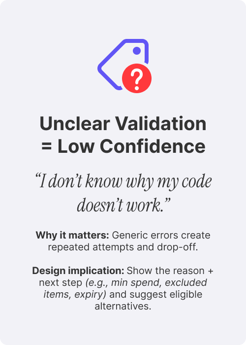 Customers often reached the checkout page, entered a code they found from email, social media or a friend, and hit a dead end, leading to repeated attempts, confusion, and abandoned carts.